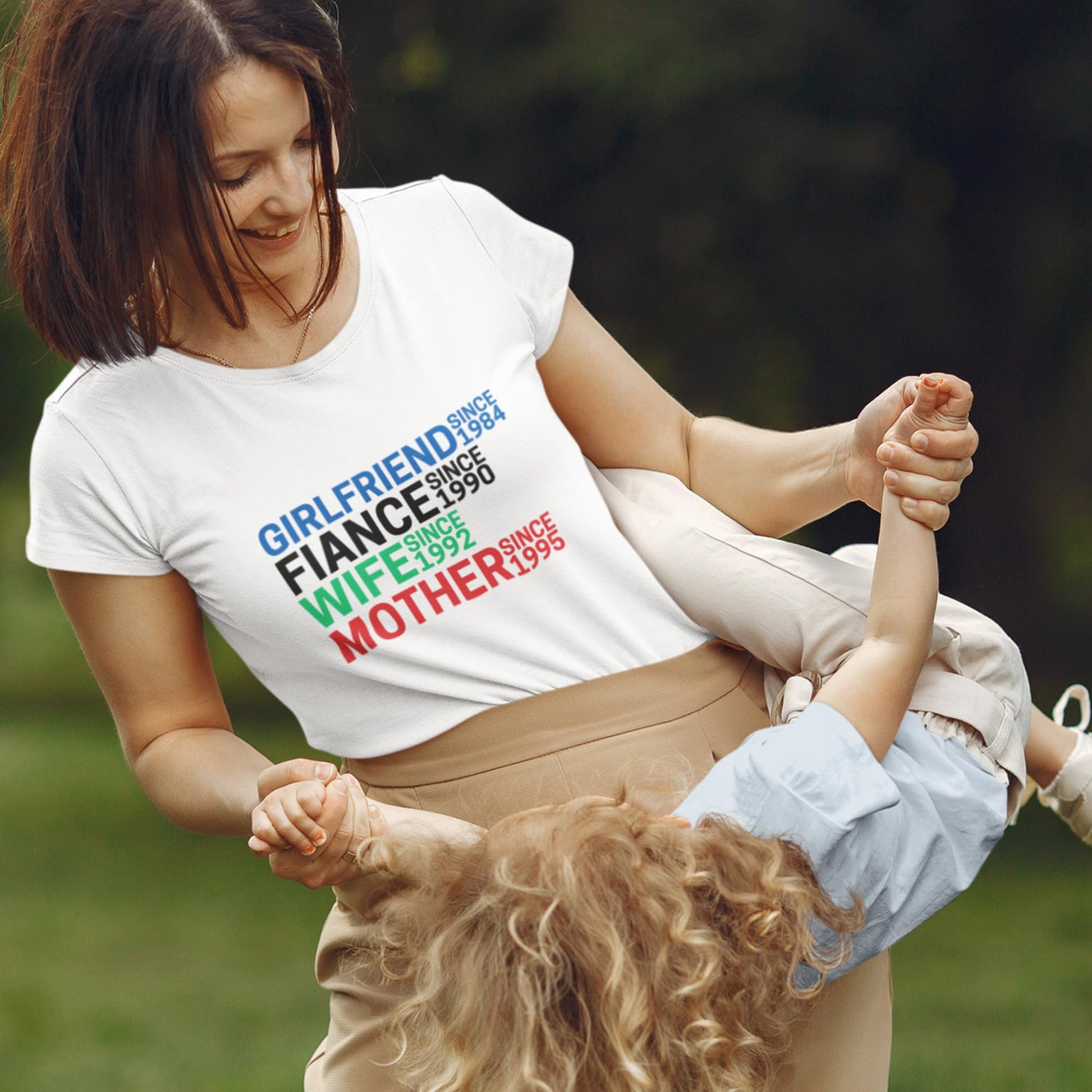 Celebrate life's beautiful journey with this charming personalised women's t-shirt that chronicles your relationship milestones. Available in crisp white and sophisticated grey, this cotton graphic tee features customisable dates marking your special moments - from girlfriend to fiancé, wife, and mother. Perfect as a thoughtful Mother's Day gift or any special occasion, this comfortable shirt tells your unique love story. The relaxed fit and soft cotton fabric ensure all-day comfort whilst making a meaningful statement. Each shirt is individually customised with your significant dates, making it a truly one-of-a-kind piece that celebrates your relationship timeline. Whether paired with jeans for a casual look or dressed up, this milestone tee becomes a cherished keepsake that documents your journey of love and motherhood.