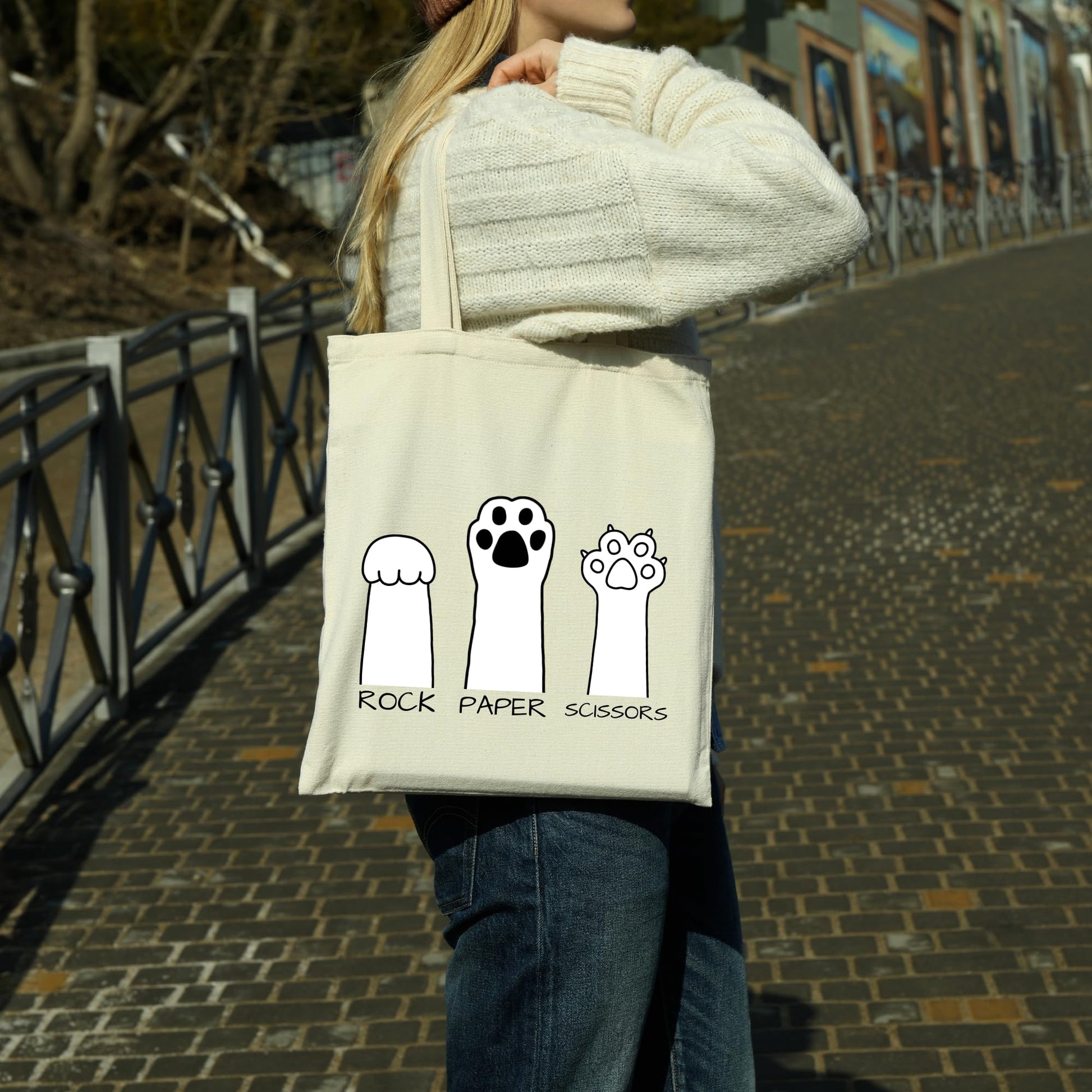 Add a touch of whimsy and feline fun to your everyday style with the Rock Paper Scissors Cat Paw Tote Bag! Featuring a playful design that combines the classic game of Rock Paper Scissors with adorable cat paws, this tote bag is perfect for cat lovers and anyone who enjoys a good laugh. Crafted from high-quality cotton, this tote bag is built to handle the demands of your daily routine. Its reinforced handles ensure durability, while the spacious interior provides plenty of room for books, groceries, or your daily essentials. Whether you’re heading to the market, the library, or a casual outing, this tote bag is the perfect companion. The highlight of this bag is its fun and quirky design. The Rock Paper Scissors Cat Paw illustration is sure to spark smiles and conversations wherever you go. It’s not just a bag—it’s a statement piece that reflects your love for cats and playful humor. Not just for personal use, this tote bag also makes a wonderful gift for birthdays, holidays, or as a thoughtful surprise for your favorite cat lover. It’s practical, stylish, and guaranteed to bring joy to their day. Order your Rock Paper Scissors Cat Paw Tote Bag today and carry your love for cats with you wherever you go!