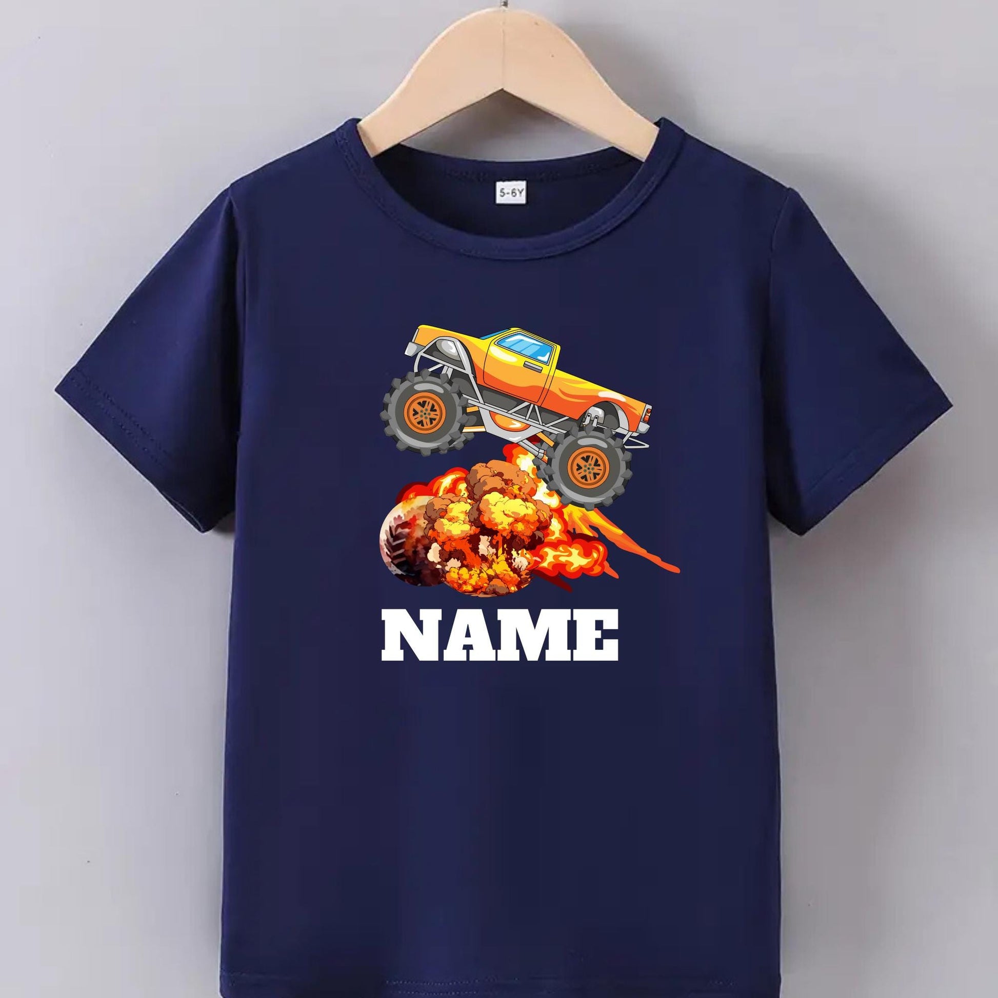 Custom Monster Truck Explosion T-Shirt for Kids – Personalized Name Tee with Fire & Blast Graphic – Cool Birthday Outfit for kids