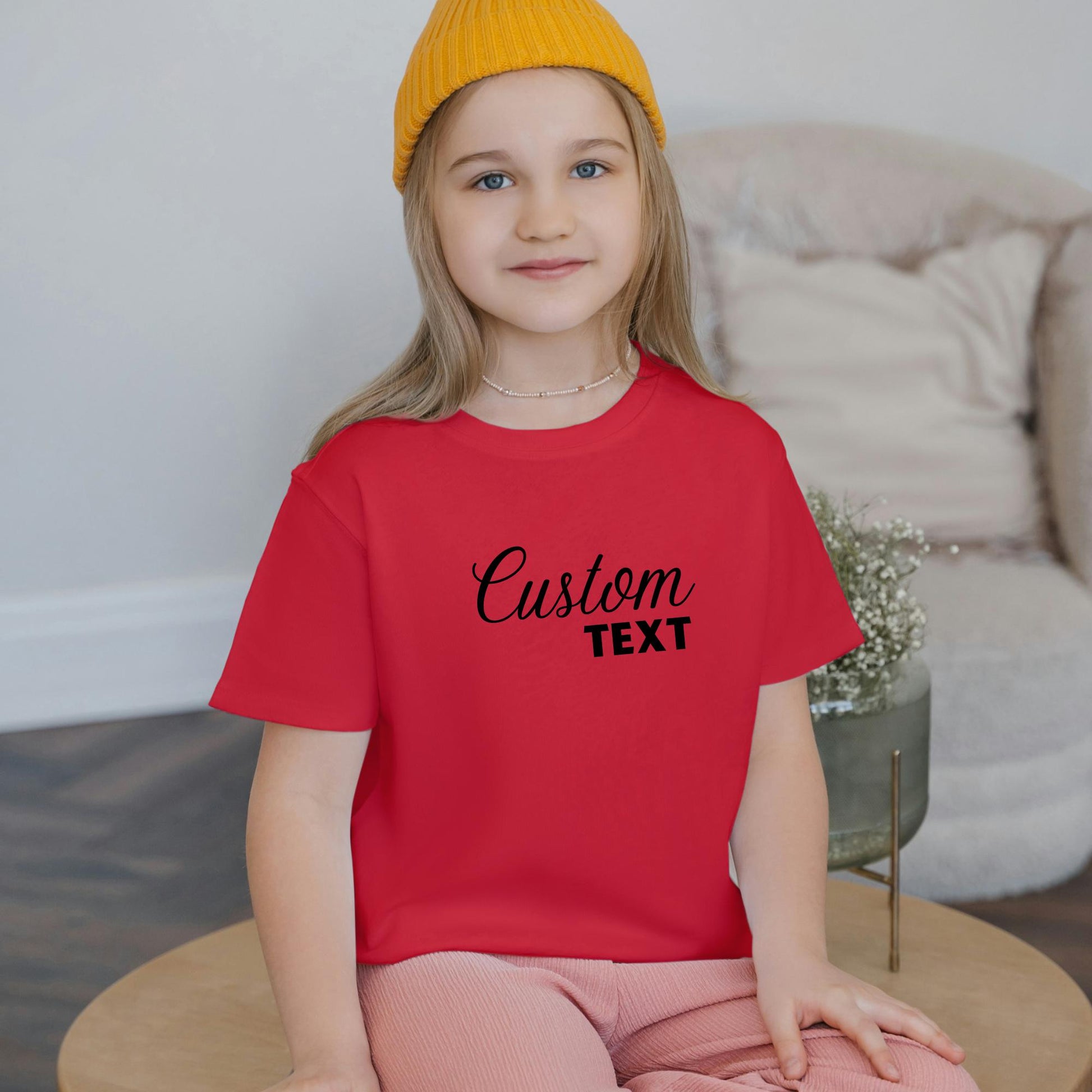 Say exactly what you want. This BeBuz personalised kids' t-shirt is printed with any text you choose — names, nicknames, funny phrases, or special messages. 100% ring-spun cotton, soft and machine washable. Available in Black, White, Red, Navy, Sport Grey, Pink and Purple. A great gift for any occasion.